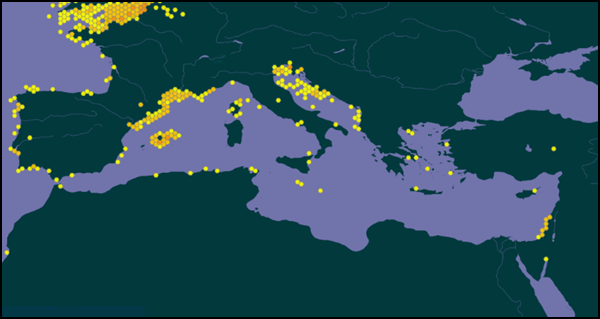 St. Carles de la Ràpita, l’Ampolla, l’Ametlla de Mar, Calafat, Tarragona, Torredembarra, Vilanova i la Geltrú, l’Hospitalet de Llobregat, Barcelona, Badalona, Mataró, Blanes, Lloret de mar, Tossa de Mar, St. Feliu de Guíxols, Palamós, Palafrugell, Begur, l’Escala, Colera i Portbou.